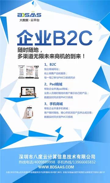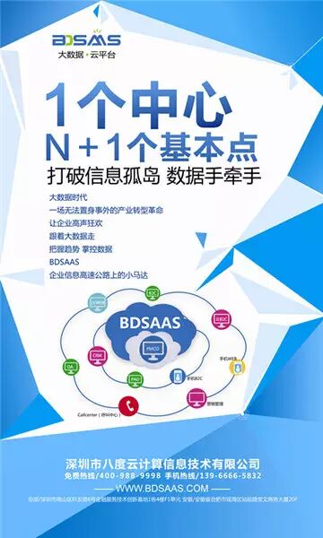 BDSAAS 是深圳市八度云计算信息技术有限公司历时两年推出的一款全新的企业大数据平台管理软件。应对未来互联网发展趋势,以全新的企业管理理念为导向,基于云计算的大数据挖掘,打破企业信息孤岛。以PMCO(产品,营销,客户,订单)为核心,将云WEB,手机WEB、企业B2C、手机商城、PAD商城、OA、CRM、CALLCENTER呼叫中心及微信,微博的信息综合到一个平台,进行数据挖掘-仓储-处理-分析-利用,根据企业需求量身定制信息化平台,解决企业经营管理上的问题,实现高效的营销决策。